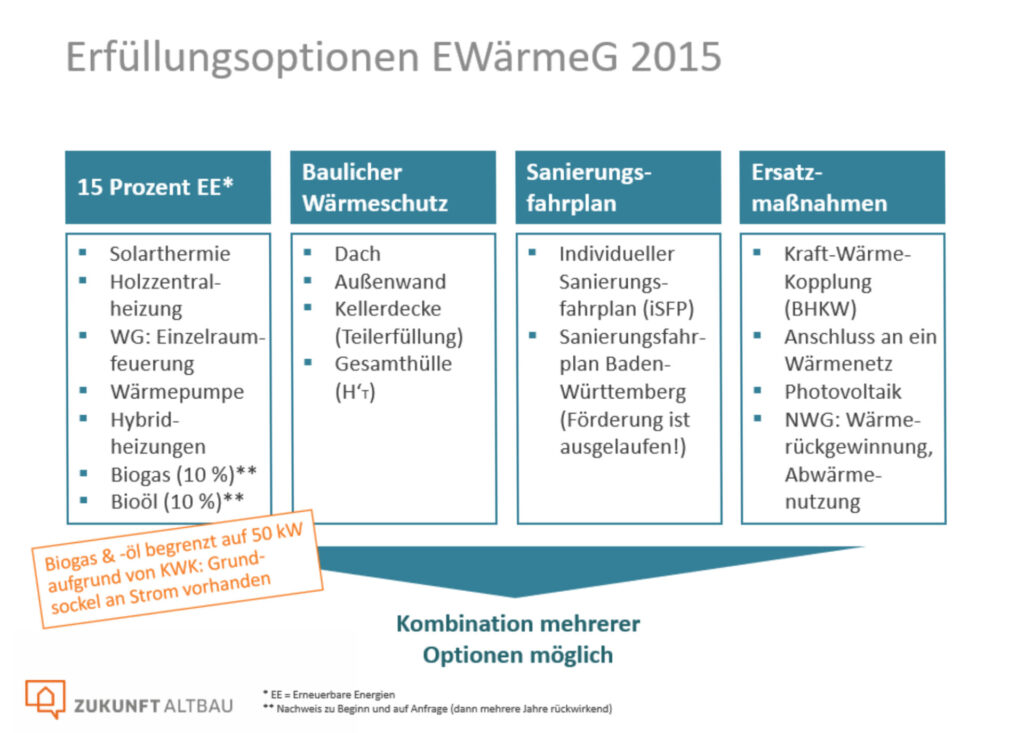 In Baden-Württemberg verpflichtet das Erneuerbare-Wärme-Gesetz (EWärmeG) Eigentümer von Bestandsgebäuden beim Austausch der Heizungsanlage dazu, mindestens 15 % des Wärmeenergiebedarfs durch erneuerbare Energien zu decken oder entsprechende Ersatzmaßnahmen nachzuweisen.